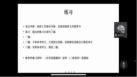 其次,21级MTI姚之扬同学发言。他先分享了自己备考二级、一级的经验,强调备考要保证充足的练习量,落实基本功。其次,他分别从二笔练习、注意事项、交传练习等方面向同学们作了详细的经验分享,提醒大家反复斟酌译稿,加强模拟练习。