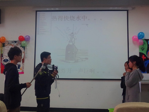 园,共创美好未来”安全宣讲视频后正式开始。外院的第一支队伍由英语3、4班组成,他们首先为在座的观众带来了一段相声——《打劫》。其诙谐的语言,搞笑的台词,不仅让观众爆发出阵阵笑声,也让大家从中获得安全知识,从而获得了评委的一致好评。接下来外院两支代表队带来的《西游之安全篇》、《如此辩论》也以其创新独到的角度活跃了赛场气氛,给观众留下了深刻印象。当所有表演告一段落时,表演嘉宾带来了一曲《爱的华尔兹》,为本次比赛添上了一笔浓墨重彩。