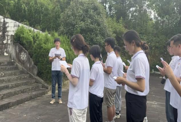 学生骨干们徒步前往新篁革命烈士纪念塔,瞻仰革命烈士纪念塔,在烈士纪念塔前集体默哀三分钟,以表追思。电气学院党员代表刘铭涛带领电气-外语学生骨干在烈士塔前齐声诵读方志敏烈士《可爱的中国》节选,缅怀革命先烈,传承红色精神。