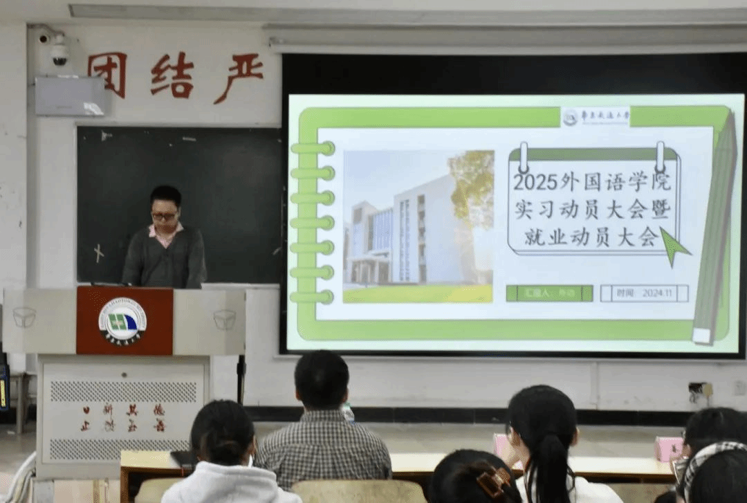 于南图301举办2025届毕业生实习动员大会暨就业再动员大会。院党委副书记光辉,实习中心主任姜浩,学工办负责人郑伟、毕业班辅导员钟雪倩出席,2025届全体毕业生参加会议,会议由郑伟主持。