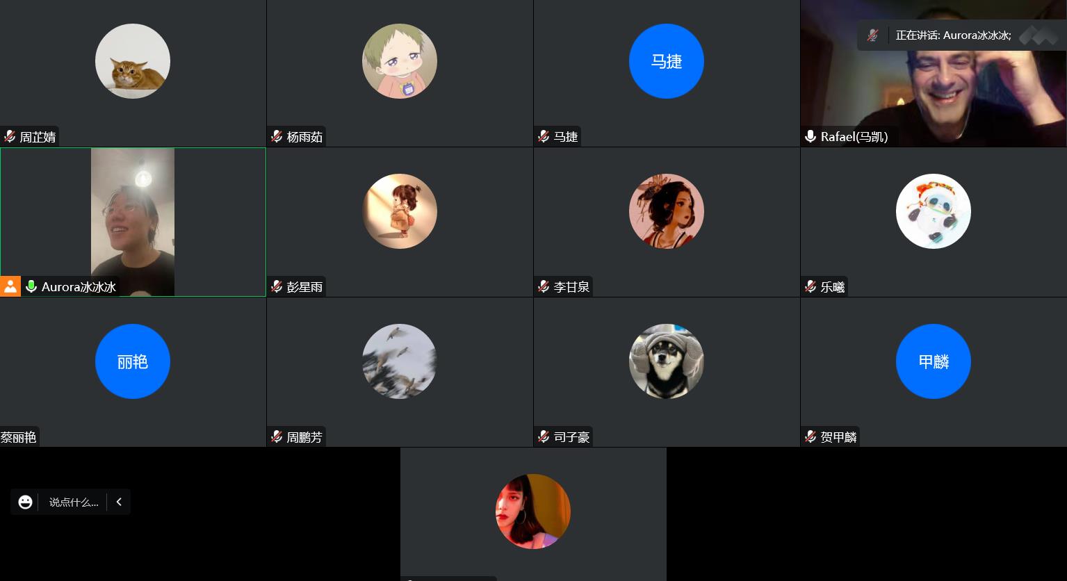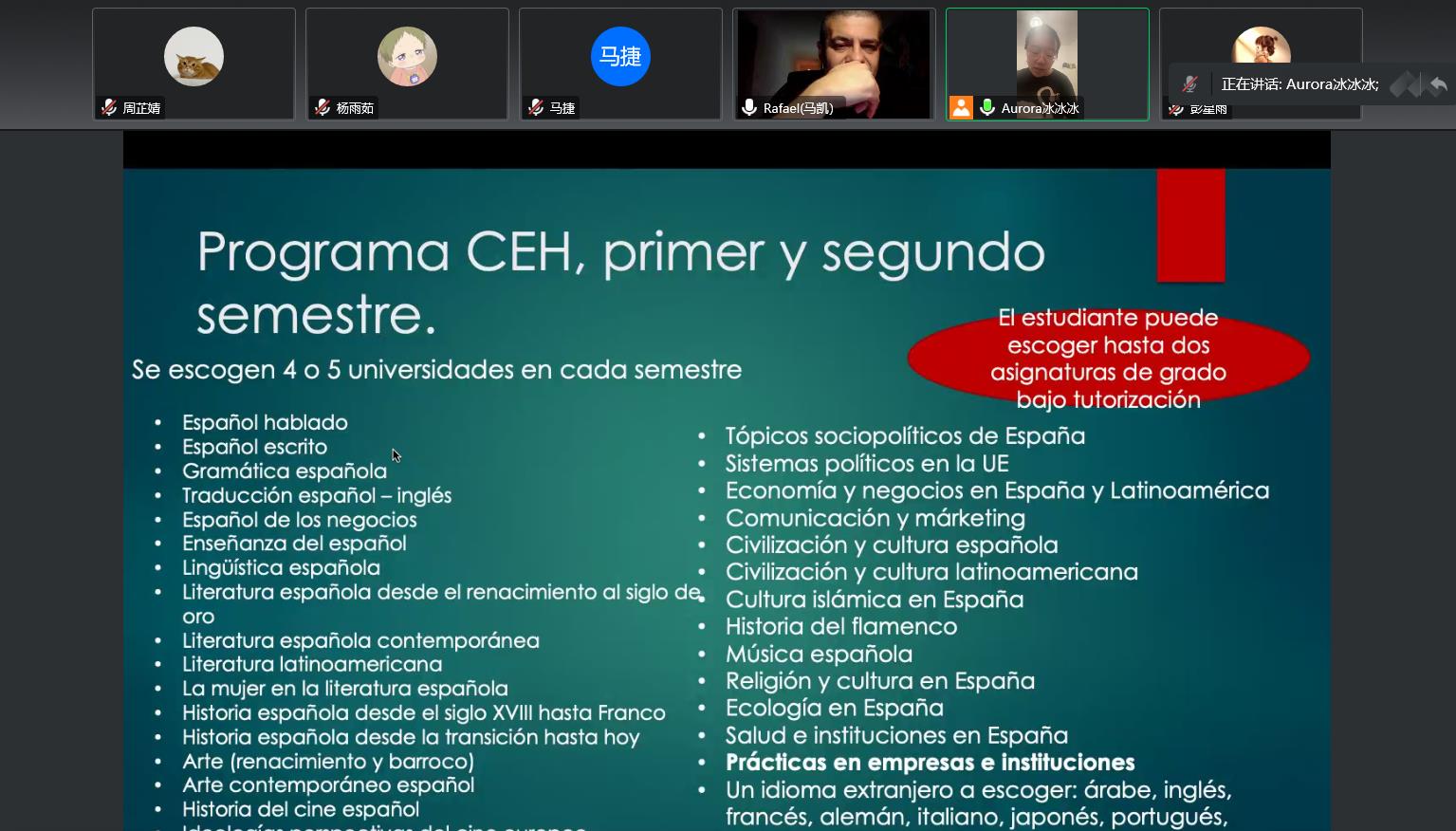 本次讲座以线上交流的形式开展,西班牙语任课老师黄冰,对项目感兴趣的同学参加会议。