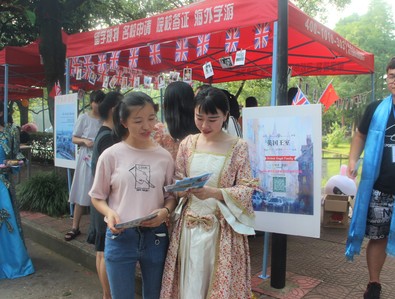 本届“红五月”英语文化艺术节以“中西文化交流”为主题,英文戏剧、英文小说、英文电影、英国王室和中国新疆、西藏、云南等省文化代表……从英语国家文化到大美中国风采,每个班级的展区都充满着文化气息,等待着同学们去感受。在一个“英式风情”的摊点上,精致的“英式”下午茶吸引了大批路人的驻足品尝,17英语(国贸)班通过独具特色的方式展示其主题“英国皇室”的魅力;17英语(国金)二班则用英文”快问快答“的方式,凸显日本av
