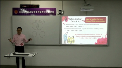 决赛分为教学设计、现场教学和教学反思三个环节,现场教学从20个教学节段中随机抽取一个,赛前60分钟准备时间,然后进行20分钟的现场授课。王宁老师所抽课题为“Love is a fallacy”,他以课文内容为主线,以逻辑谬误剖析为重点展开教学设计,运用经典电影片段和生活案例,同时将思政元素融入其中,教学设计巧妙,语言幽默风趣。王宁老师在比赛现场表现从容淡定,展示了外语教师的良好精神风貌。
