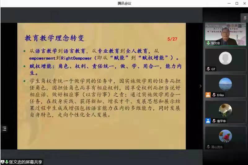 首先,张文忠教授对我国外语学习现状进行了简要评述。他提到,传统上学用分离、学做分离的学习方法导致我国学生英语学习费时低效,语言能力不足。对此,他提出了做学用合一的赋权增能型英语教育的理念。