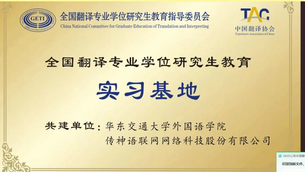 与传神语联网网络科技股份有限公司共同申报,成功获得由全国翻译专业学位研究生教育指导委员会与中国翻译协会颁发的“全国翻译专业学位研究生教育实习基地”认证。