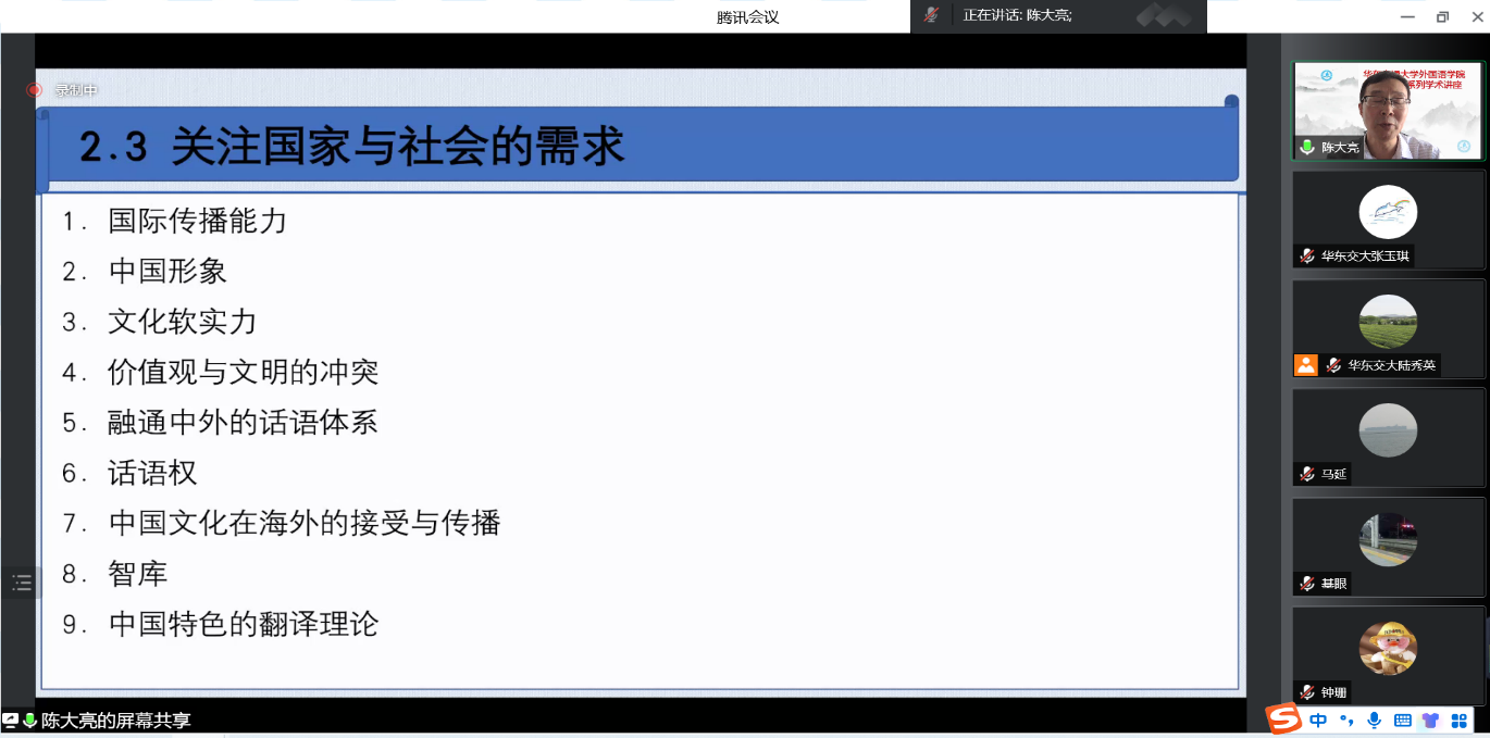 微观层面,陈教授举例说明国家社科基金项目与期刊论文的选题技巧,建议翻译研究选题要时刻关注国家与社会的需求,并跟进期刊论文的最新动态,考量选题的研究价值与意义。目前的研究热点主要集中于知识翻译学、翻译批评、翻译手稿、语料库翻译研究、生态翻译学、译者研究、翻译与形象构建、国家意识、国家翻译能力、国家翻译实践等。