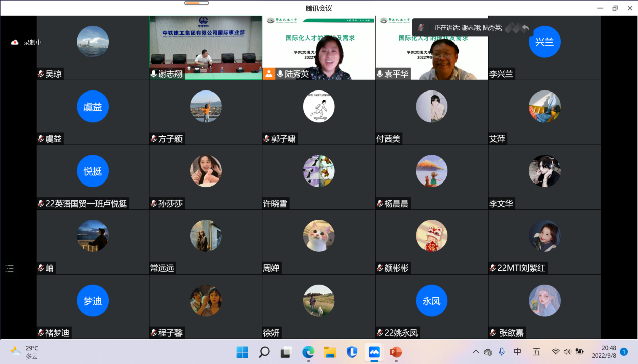 2022年9月8日晚上,中铁建工集团国际事业部(北京)总经理谢志翔应日本av 邀请在线为学院师生带来一场题为“国际化人才的现状及需求”的线上学术讲座。讲座由学院副院长(负责学院行政工作)袁平华教授主持,并由副院长陆秀英教授总结。
