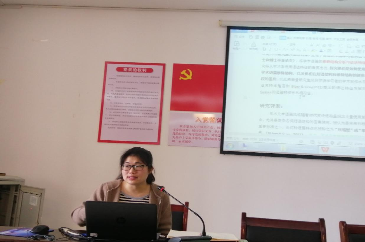 交流会上,研究所成员陶国潇老师首先分享了自己的申报选题:《基于语料库的中国学习者学术语篇修辞结构下的短语结构复杂度研究》。在展示自己选题构想的同时,首次参与项目申报的陶老师也积极向参会的老师们“取经”,大到选题范围的把握,小到标题的打磨,多位经验丰富的老师热情地提供了许多宝贵意见。