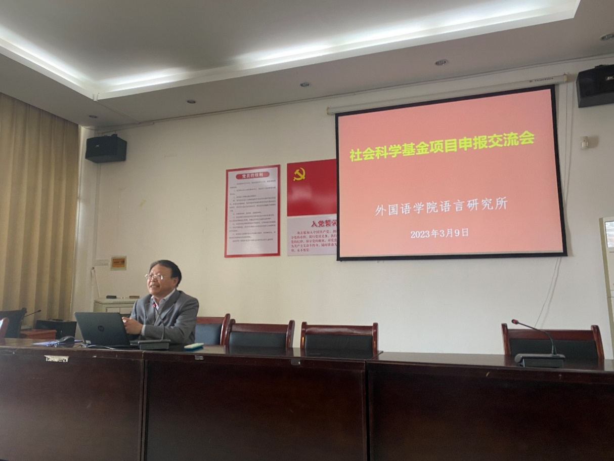 语言研究所所长袁平华教授主持召开了社会科学基金项目申报交流会。学院教师积极参与,多位老师分享了各自的项目申报选题,其他老师也对这些项目选题交流了自己的看法,并提出了许多宝贵建议。