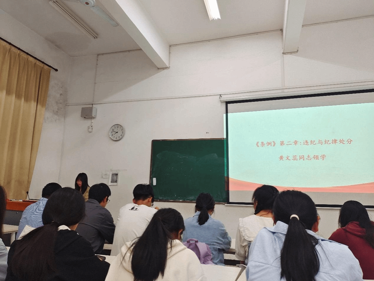 随后,支部开展了《中国共产党纪律处分条例》学习。周芷婧同志领学了《条例》第一章——总体要求和适用范围;黄文蕊同志领学了《条例》第二章——违纪与纪律处分;随后全体党员集中自学《条例》三至五章。
