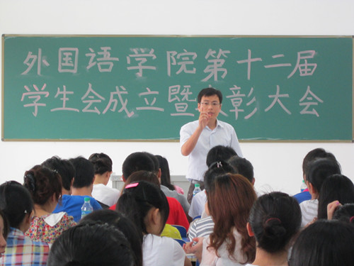 开展的各项活动时,他再一次表扬了那些在大英赛中默默奉献的志愿者,称他们的工作非常辛苦,无论是插彩旗还是搬桌子,每项工作都完成得很好。在表示对新一届学生会成员的祝贺时,他说,“独木难成舟”,学生会的每个部门都必须是一个团体。他还强调,学生会成员现在做的每一件小事都可能是对未来成就的一种积累,平凡的学生也会有不平凡的人生。吴正才又以07级优秀学生党浩以及吴鹏云的成长经历来激励在场每位学生认真做好每一件小事。大会在李慧敏的致辞中圆满落下了帷幕。