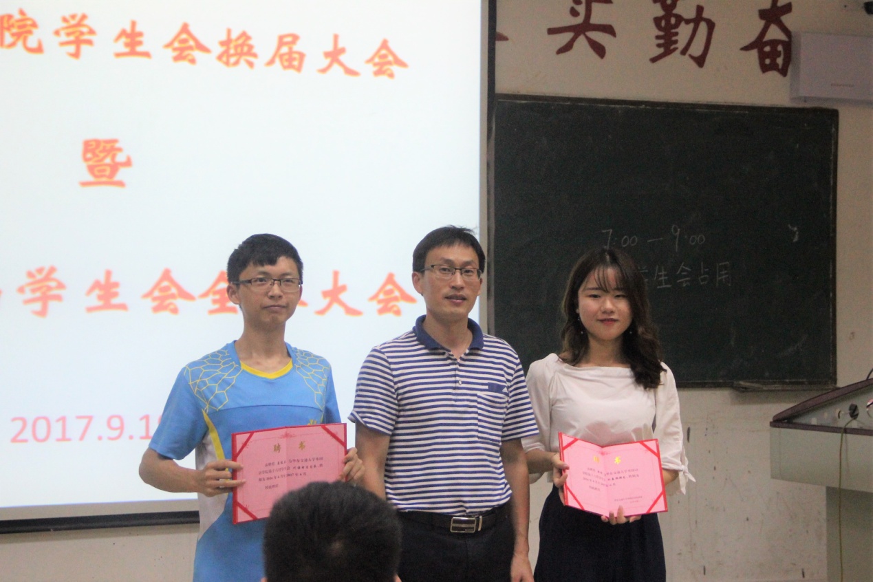 之后,学工办主任兼团委书记刘芳馨为第十六届学生会部级成员颁发聘书。院党委副书记王朗为第十六届学生会主席团成员颁发聘书。接着,辅导员郑伟宣读新一届学生会成员名单并对他们的成功加入表示祝贺。