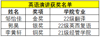 共有9名学子荣获佳绩。22级翻译专业邹怡佳在演讲比赛中荣获金奖并成功晋级全国决赛,20级翻译专业邹啸堃在阅读比赛荣获金奖并成功晋级全国决赛。